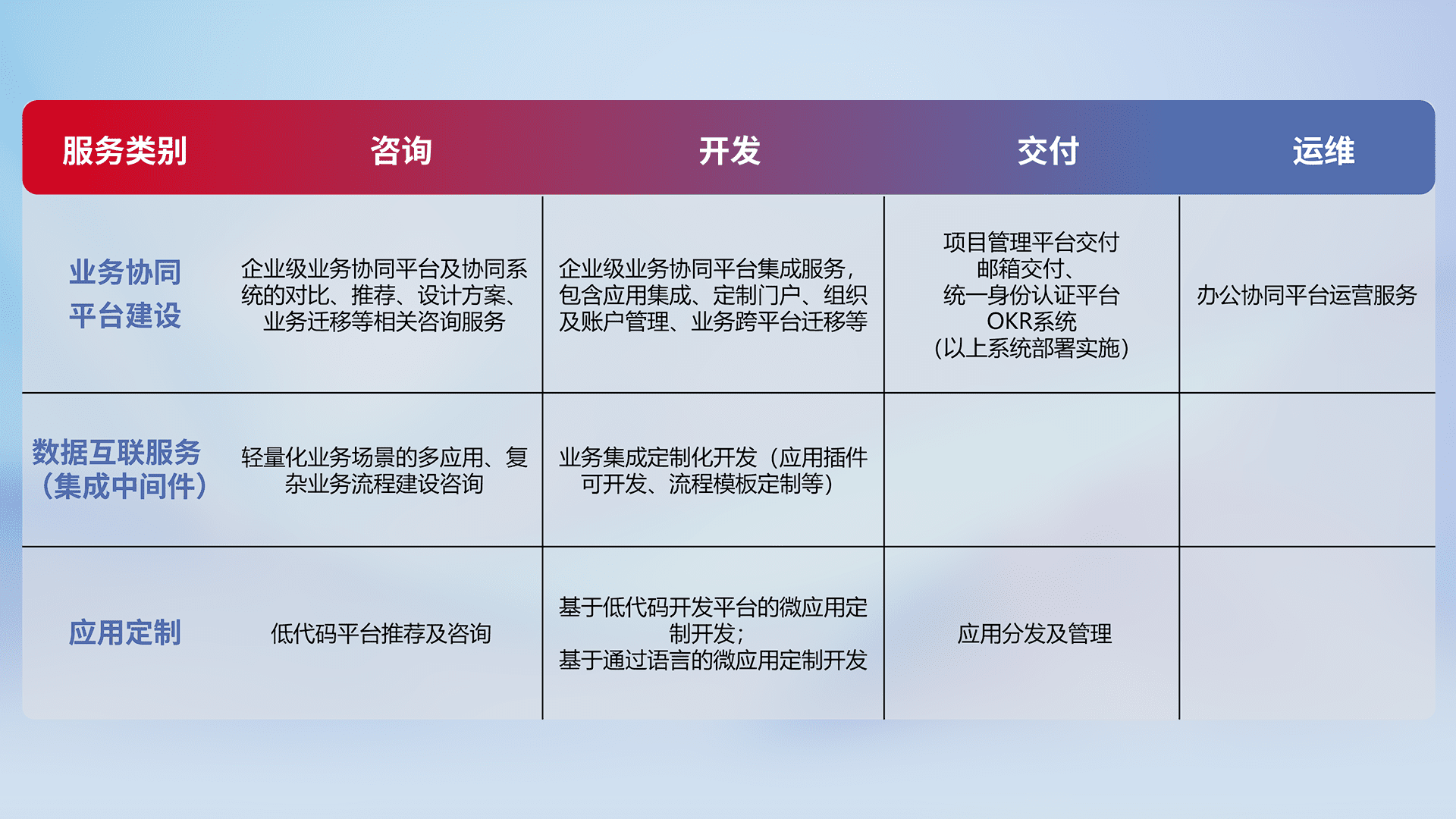 针对钉钉、、企微、、、IDaas等平台级产品提供产品的规划、、、、方案、、、、交付、、、定制化开发等服务,,,,实现如统一协同办公、、智能客户服务、、混合会议管理、、智能数据查询、、等业务场景,,实现数字化转型。。